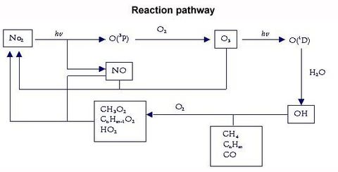The model takes into account the emissions, chemistry, transport and deposition of tropospheric trace gases. The chemical mechanisms are summarised in the adjacent figure, where the inner cycle involves the photo dissociation of NO2 leading to ozone and NO formation, and the subsequent back reaction of these species to regenerate NO2. Competing with this back reaction is the outer cycle involving the formation of peroxy radicals from methane, nonmethane hydrocarbons and carbon monoxide.