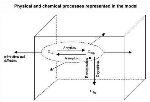 Radionuclides are treated in the model as being distributed between three phases, i.e. dissolved in seawater, attached to suspended material and deposited in the seabed. The dissolved and suspended phases are both assumed to be transported with the water flow rates. Exchange between the water column and the seabed takes place by a representation of the mechanisms of deposition and resuspension.