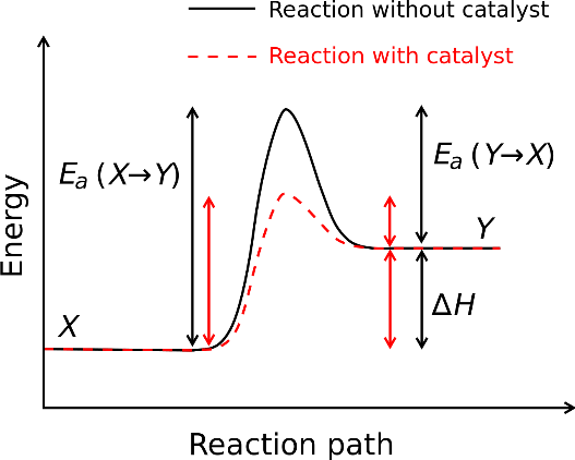 Generic potential energy diagram showing the effect of a catalyst in a hypothetical endothermic chemical reaction. The presence of the catalyst opens a new reaction pathway (shown in red) with a lower activation energy. The final result and the overall thermodynamics are the same.