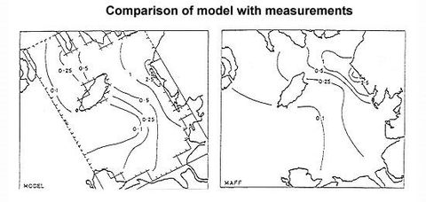 To simulate transport in the water column, the model calculates by finite differences the solution of the two-dimensional advection-diffusion equation. The coefficients describing transport are taken to be constant in time and are based on annually averaged values. A stream function is used to implement the advective residual current arising from tidal motions, wind-driven or density currents. The residual current was taken from a hydrodynamic model. Diffusion is used to represent tidal mixing and shear-diffusion.